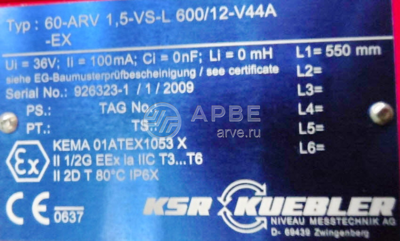 60-ARV 1.5-VS-L 600/12-V44A-EX датчик sn 926323-1/1/2009 KSR KUEBLER