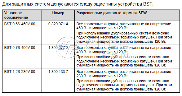 Модуль BST с системой безопасного отключения тормоза обеспечивает питание дисковых тормозов фирмы SEW-EURODRIVE и управление ими. Допустимые комбинации модуля BST с системой безопасного отключения тормоза и дисковых тормозов SEW указаны в разделе "Допустимые комбинации устройств" в главе "Требования по технике безопасности". Модуль BST с системой безопасного отключения тормоза предназначен для использования в приводах промышленных установок и должен применяться только в соответствии с данными технической документации SEW-EURODRIVE и данными заводской таблички.