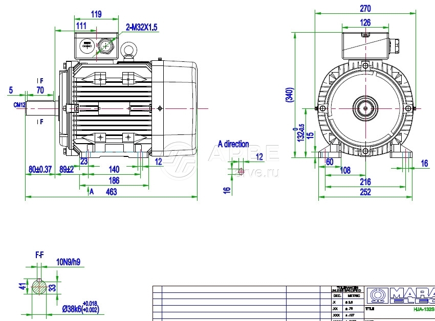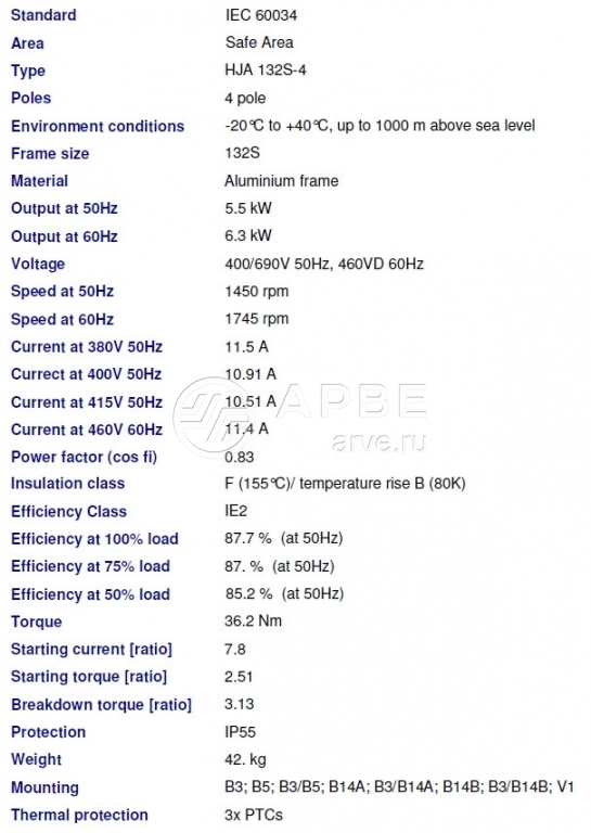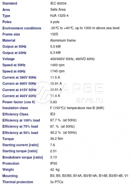 Двигатель HJA 132S-4 5.5kW 400/690V 1450rpm IE2 IP55 3xPTCs B3 Marathon-Regal