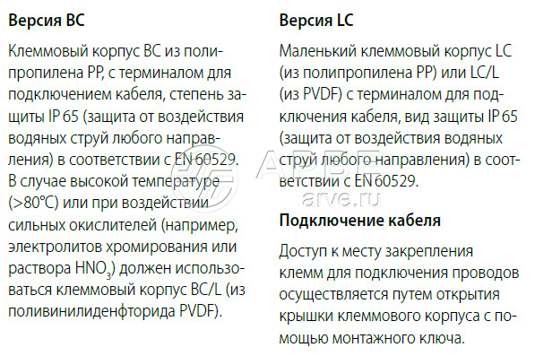 Стержневые датчики уровня доступны с маленьким клеммовым корпусом LС (из PP) или и LС/L (из PVDF) и большим клеммовым корпусом BC (из PP) или BC/L (из PVDF).