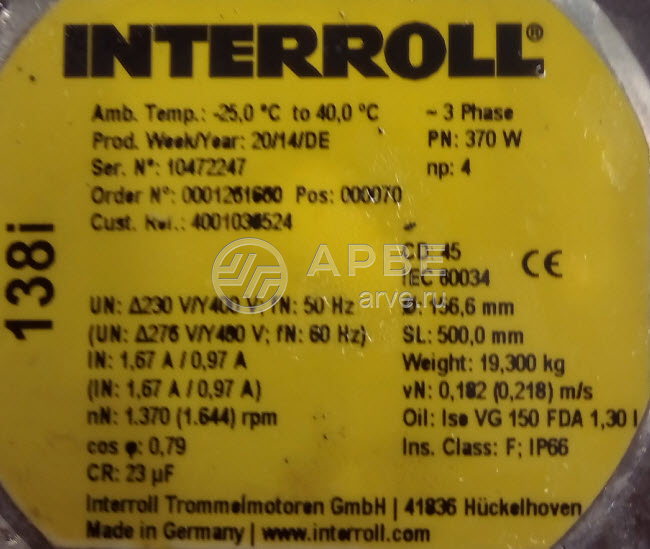 Мотор Барабан DM138, 0.37кВт, 0.23м/с,3*230-400В 50Гц, SL=500мм, FW=507мм, EL=530мм, AGL=580мм, клеммная коробка, нер. сталь, покрыта белой резиной с профилем под ленту UNi серии MPB (10 зубов), длина 500 мм, диаметр