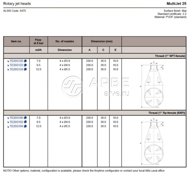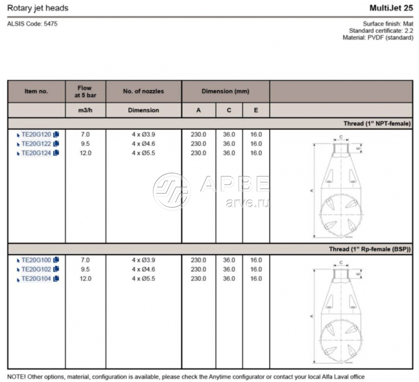• Моющая головка MULTI JET 25 1" TE20G104  Alfa Laval BSP NOZZLES 4X@5,5, 12 M3/H