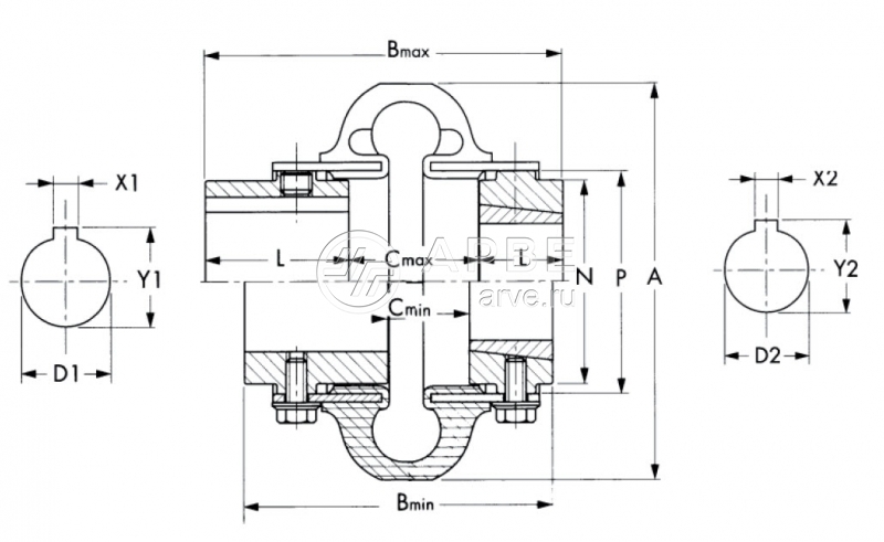 | Размер муфты | Тном | n макс. | D1 | D2 | A | B1 | B2 | C1 | C2 | L1 | L2 | N1 | N2 | P | m* | J* | |||||
