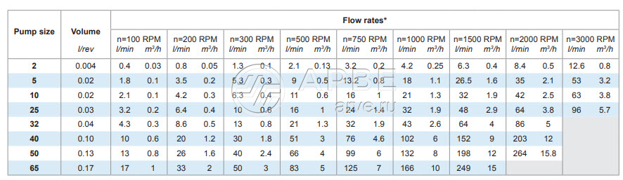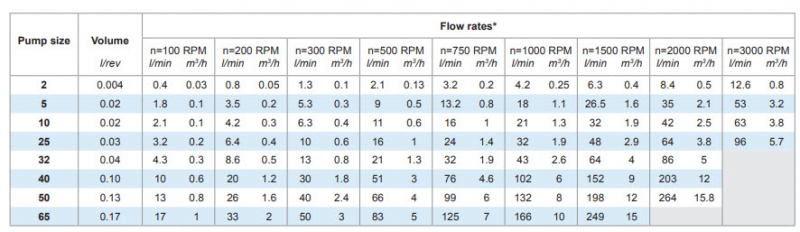 • Pressure: 120 bar • Suction lift: 6 m • Flow rate: 0.4 to 300 l/min (0.025 to 18 m3 /h) • RPM: 3,000 RPM • Efficiency: 60 to 92% • Viscosity: 0.5 to 25,000 mPas* • Temperature: -60 to 450°C