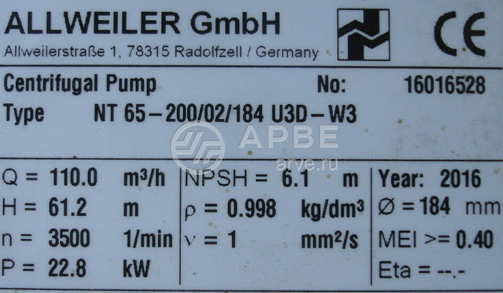 NT 65-200/02/184 насос # 16016528 ALLWEILER