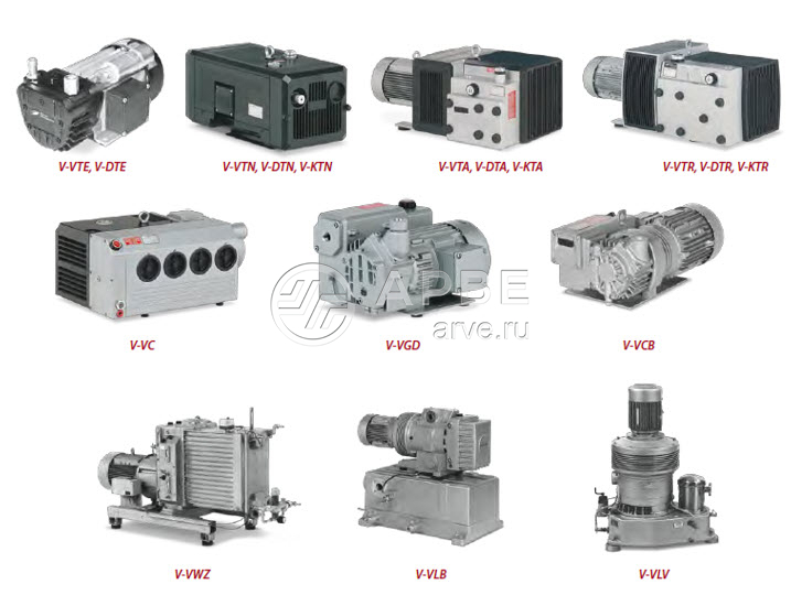 Серия V. Сухие пластинчато-роторные насосы, компрессоры и насос-компрессоры. Маслосмазываемые пластинчато-роторные насосы. Пластинчато-роторные вакуумные насосы с проточной смазкой. Дополнительные аксессуары для пластинчато роторных насосов, компрессоров и насос-компрессоров.