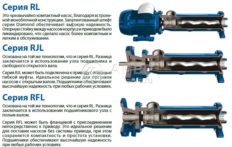 Насосы серии R с плавающим статором имеют следующие преимущества: насос занимает мало места и не требует больших затрат в обслуживании. Статор закреплен только с одного края так, чтобы позволить эксцентричное движение ротора посредством очень простого сочленения. Насос предназначен для использования в пищевой и косметической промышленности.