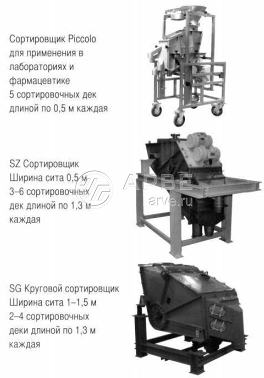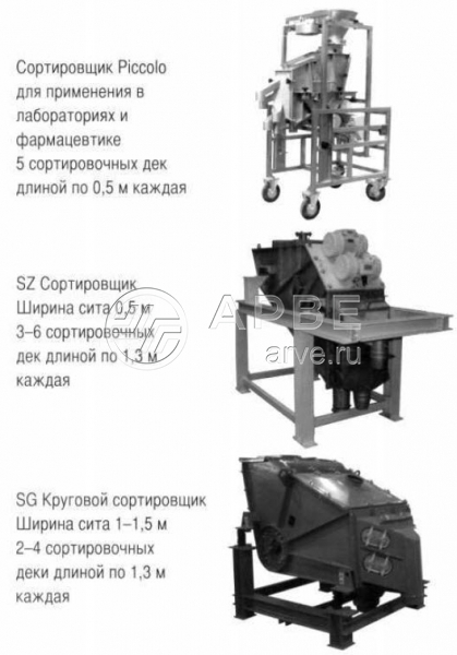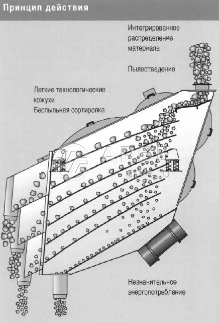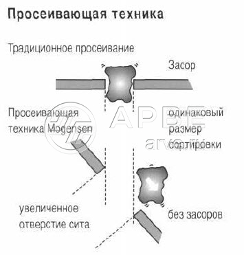 Поскольку ситовые полотна имеют различный наклон,возникает эффект уменьшения размеров их отверстий. Именно поэтому существует возможность использования необычно крупных ячеек по сравнению с обычными горизонтальными ситами при одновременном сохранении стабильно высокого качества сортировки. Отделение различных фракций из потока материала и более крупные размеры отверстий ситовых полотен по сравнению с зернистостью обрабатываемой субстанции, не только способствуют предотвращению образования наслоений и засоров на ситовых полотнах, но и обеспечивает наряду с высокой пропускной способностью также и чрезвычайно долгий срок службы ситовых полотен.